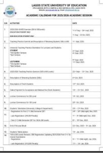This is to inform all students of the Lagos State University of Education (LASUED) that the school management has released the approved academic calendar for the 2025/2026 academic session as follows;